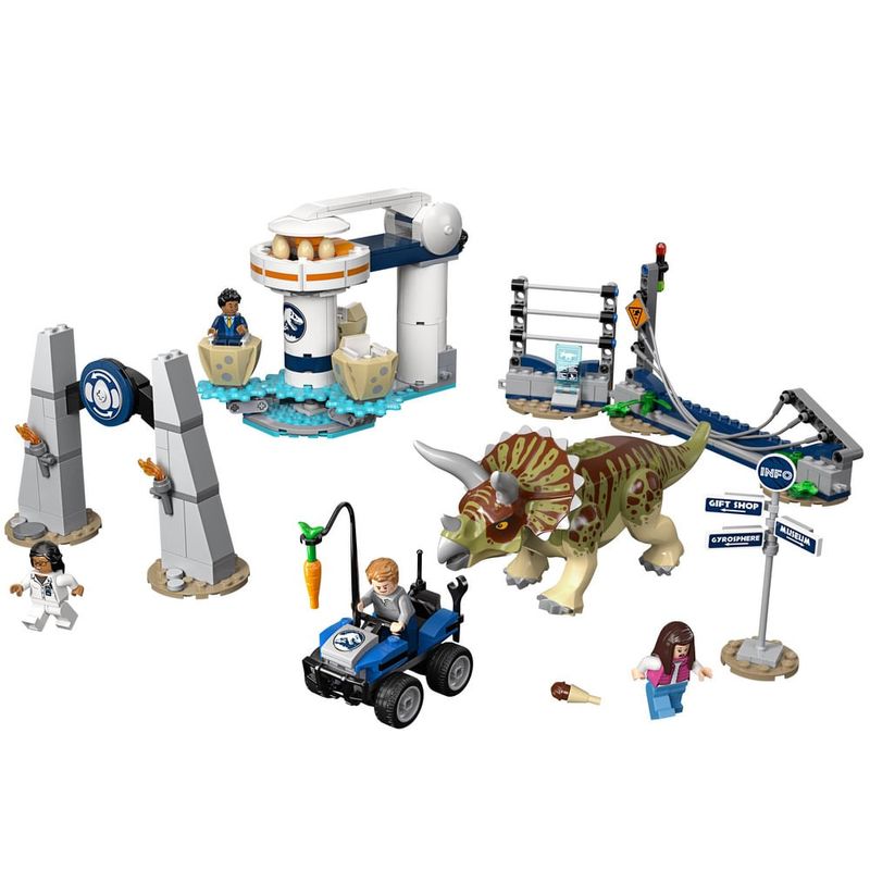 Os jovens vão adorar criar emocionantes aventuras de ação em dinossauros com este conjunto de construção LEGO® Jurassic World 75937 Triceratops Rampage O playset colorido inclui um passeio de Egg Spinner com 3 assentos de ovo de dinossauro para minifigures e uma função de fiação, além de um portão e área de espera para o passeio Há também uma figura de dinossauro de brinquedo de Triceratops posable, uma cerca desmontável e um buggy de minifigure para jogar fora uma fuga de dinossauro e perseguição Este brinquedo de construção para crianças inclui 4 minifigs Jurassic World para inspirar role-play criativo