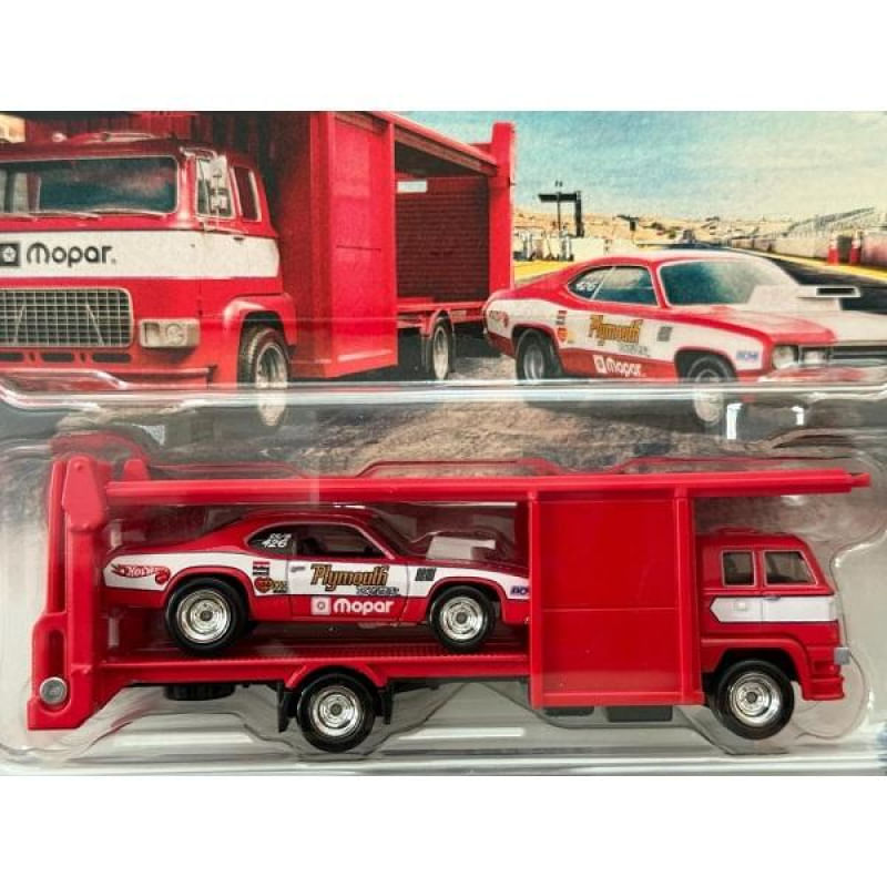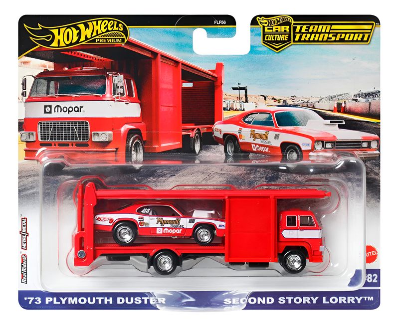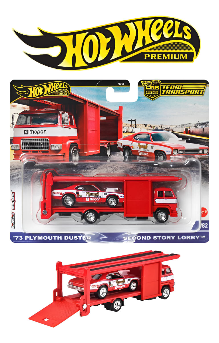 A coleção Hot Wheels Premium Team Transport traz um set imperdível para fãs de drag racing: o clássico Plymouth Duster Funny Car acompanhado do caminhão Second Story, ambos em escala 1:64