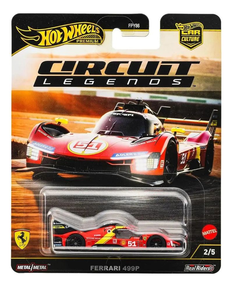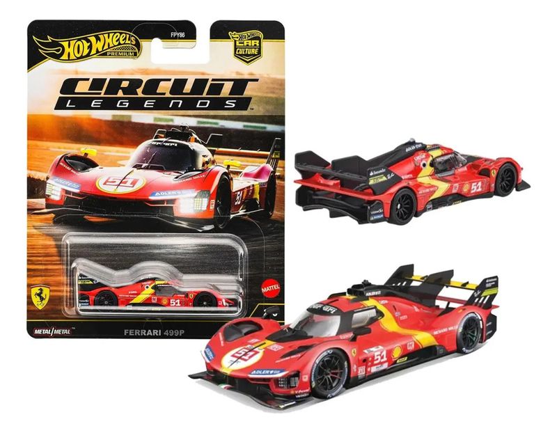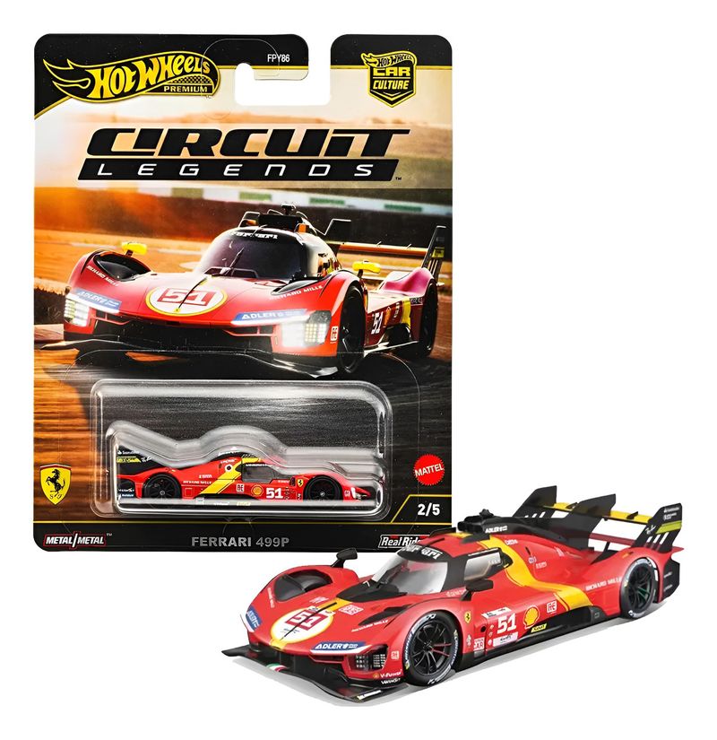 O Hot Wheels Premium Circuit Legends Ferrari 499P é uma miniatura de alta qualidade em escala 1:64, com corpo e chassi 100 em metal e pneus de borracha Real Riders Inspirado no carro 51 da AF Corse, apresenta pintura vibrante, acabamento impecável e detalhes autênticos, sendo licenciado oficialmente pela Ferrari Ideal para colecionadores, é parte da linha “Car Culture” e combina beleza para exposição com realismo para brincar Item valioso e cobiçado, com edições limitadas e grande apelo entre fãs de automobilismo e da marca Ferrari