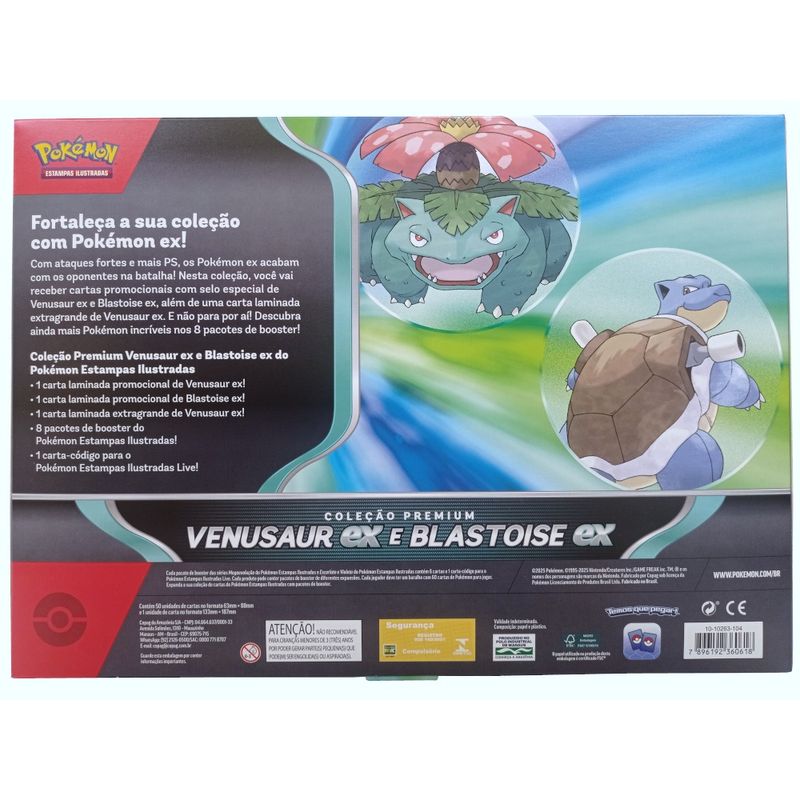 Com ataques fortes e mais PS, os okémon ex acabam com os oponentes na batalha! Nesta coleção, você vai receber cartas promocionais com selo especial de Venusaur Ex e Blastoise Ex, além de uma carta laminada extragrande de Venusaur Ex E não para por aí! Descubra ainda mais Pokémon incríveis nos 8 pacotes de booster!